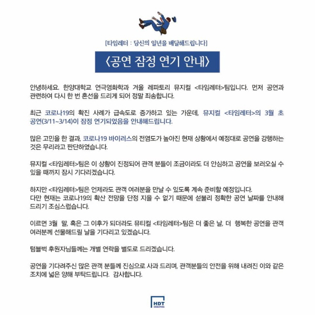한양대학교 연극영화학과 겨울 레파토리 뮤지컬 '타임레터'팀이 26일 공연을 잠정 연기한다고 밝혔다.