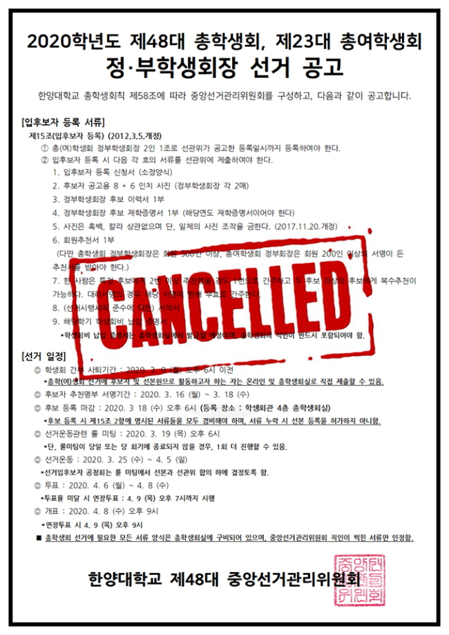 제48대 중앙선거관리위원회가 6일 제48대 총학생회와 제23대 총여학생회 선거 일정을 취소한다고 밝혔다.