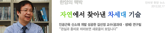 최근 과학계에는 생체모방, 자연모방이 큰 화두로 떠오르고 있다. 자연에서 생존한 방식들이야말로 최선과 첨단기술의 집약체인 것이다. 최근 우리대학 공과대 김선정 교수(공과대·생체) 연구팀의 신소재 개발이 화제다. 거미줄의 구조를 닮은 신소재 개발 성공으로 ‘꿈의 섬유’로 불리는 거미줄에 한걸음 더 다가선 것이다. 김 교수팀의 이번 성과는 잠재가치가 커 국내를 넘어 전세계적으로 주목받고 있다. 인터넷한양 뉴스팀은 김선정 교수를 만나 신소재 개발에 관한 자세한 이야기를 나눴다.