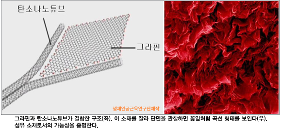 “이 신소재는 거미줄의 구조를 닮았어요. 거미줄을 나노 단위로 확대하면 실과 면이 이루는 복합구조를 볼 수 있어요. 저희는 여기에서 아이디어를 찾았습니다. 그래핀은 쌓을수록 평면에 가까워지는 성질이 있고, CNT는 원통형 막대 형태를 가지고 있습니다. 이 둘을 물리적으로 결합시켜 고분자 화합물과 섞었어요. 그러자 나노 구조가 자기배열(Self-alignment), 즉 스스로 일정한 형태로 배열하며 거미줄의 구조를 재현한 것입니다. 이를 잘라보면 단면이 꽃잎처럼 주름져있어요. 유연한 섬유로 쓰일 수 있다는 증거입니다.”