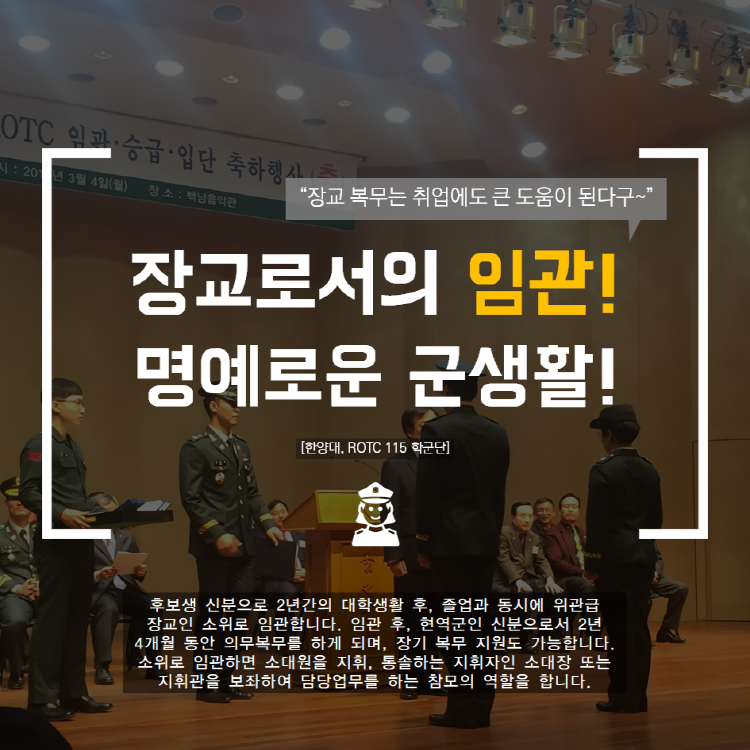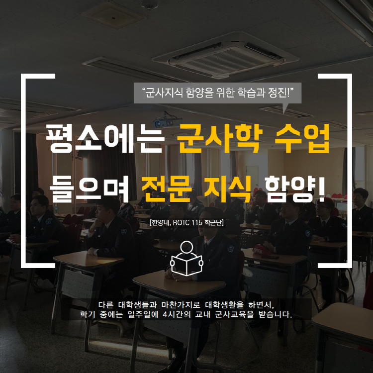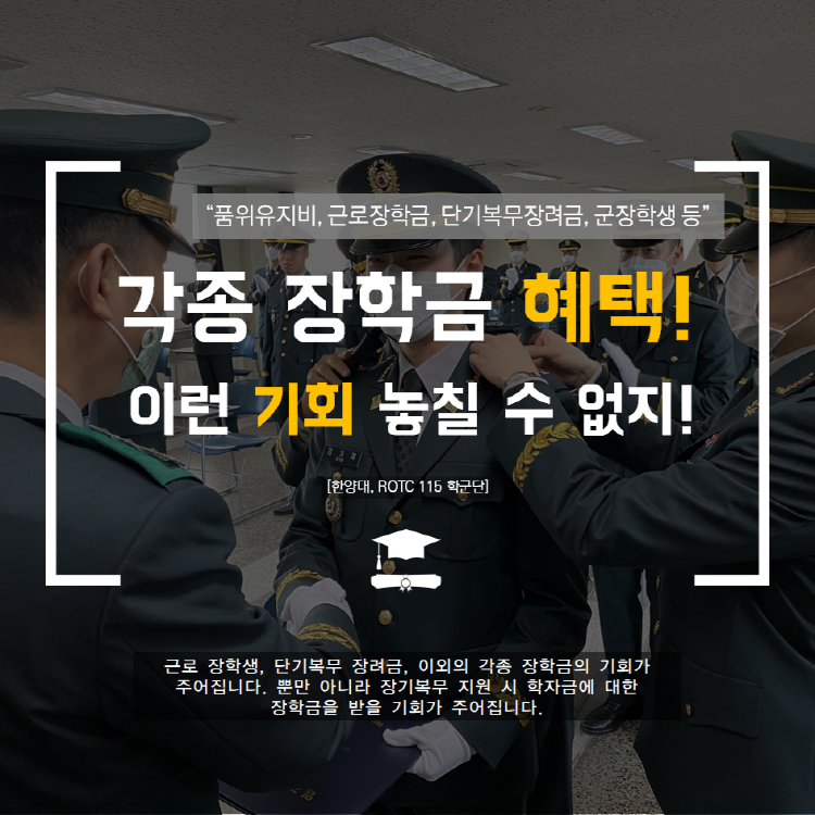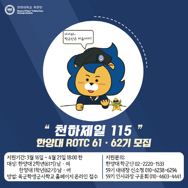 학군사관(ROTC: Reserve Officers' Training Corps)은 대학 재학생 중에서 우수자를 선발, 2년간 군사교육을 실시하여 대학의 전공학문은 물론 군사지식을 갖춘 우수한 장교 양성 과정입니다. 한양대학교 #115학군단의 61기, 62기를 모집 관련하여 안내 드립니다.