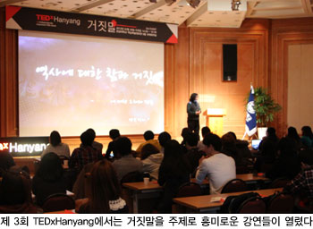 거짓말에 숨겨진 비밀을 밝힌다. 거짓말을 주제로한 제 3회 TEDxHanyang이 지난 2월 29일 백남학술정보관 6층 국제회의실에서 열렸다. 이날 행사에는 3명의 연사자가 나와 개성 넘치는 강연을 선보였다. 행사를 총괄한 이현주 양은 인사말에서 "일상 속의 거짓말들을 비판적으로 바라보고, 그 속에 숨겨진 불편한 진실을 찾고자 한다"며 "이번 행사를 통해 많은 영감 얻어가길 바란다"고 취지를 밝혔다. 연사자들의 강연이 끝난 후 참가자들은 한양대 앞 카페 Arte로 자리를 옮겨 소셜파티를 가졌다.