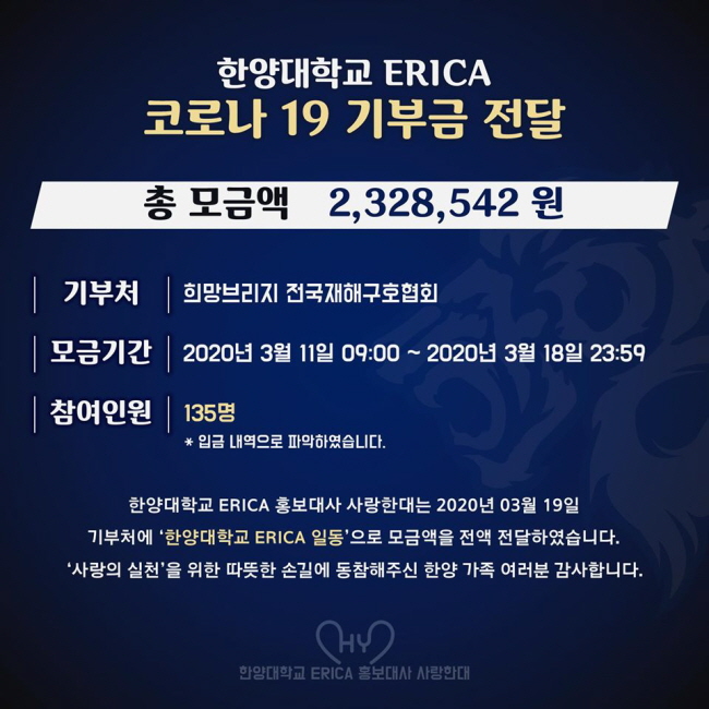 지난 3월 11일, 한양대학교 ERICA 홍보대사 사랑한대는 코로나19로 인해 피해와 혼란을 겪고 있는 국민들과 의료진을 위한 모금을 시작했다. 모금은 3월 18일까지 진행됐으며 총 135명의 학생이 참여했다. 누적 모금액은 2,328,542원이다. 이 기부금은 3월 19일 <한양대학교 ERICA 일동>으로 '희망브리지 재해구호협회'에 전액 전달됐다.