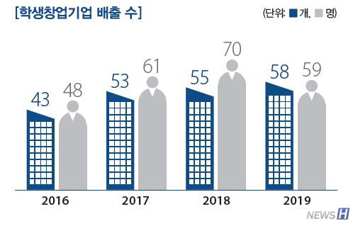 창업기숙사, 글로벌 스타트업 멘토단 등 타 대학과 차별화된 창업지원 인프라 구축으로 작년 한 해에만 58개 학생창업기업을 배출, 12억 원의 매출을 달성했다.
