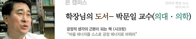 몇 년 전 각종 서점의 베스트셀러를 휩쓴 자기계발서 중 긍정 에너지의 힘을 강조한 책이 있다. 바로 <시크릿>이다. 학장님의 도서 시리즈, 이번 주는 “삶의 고비마다 자신의 원동력이 되는 긍정적인 마음 에너지를 지니고 있어야 한다”며 <시크릿>을 추천한 박문일 교수(의대·의학) 를 만났다. 박 교수는 <시크릿>이 말하는 긍정 에너지의 바탕이 되는 마음 에너지를 강조했다.