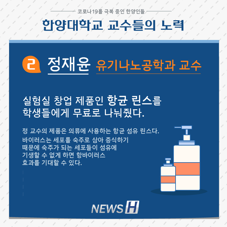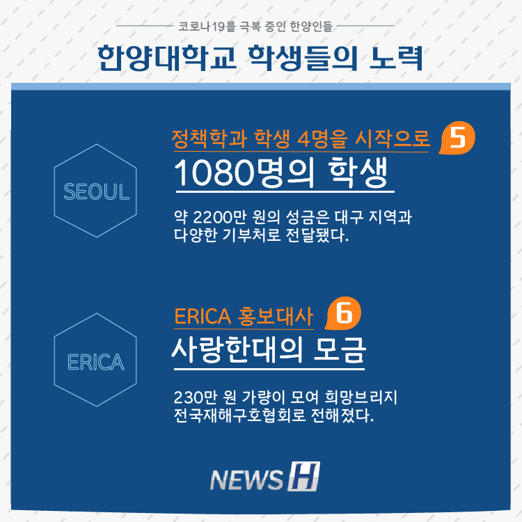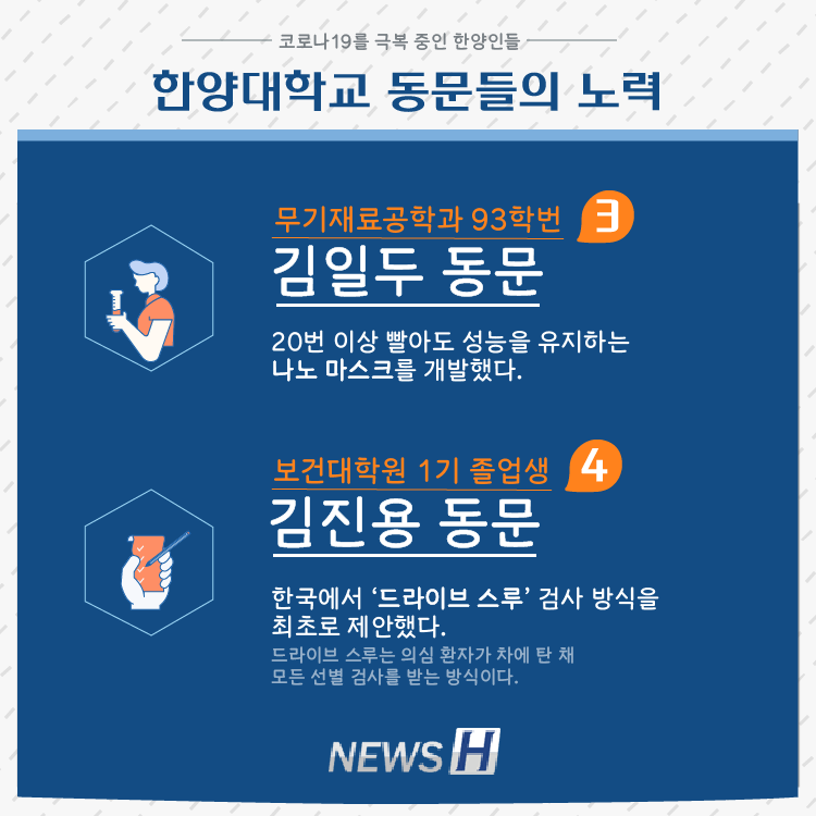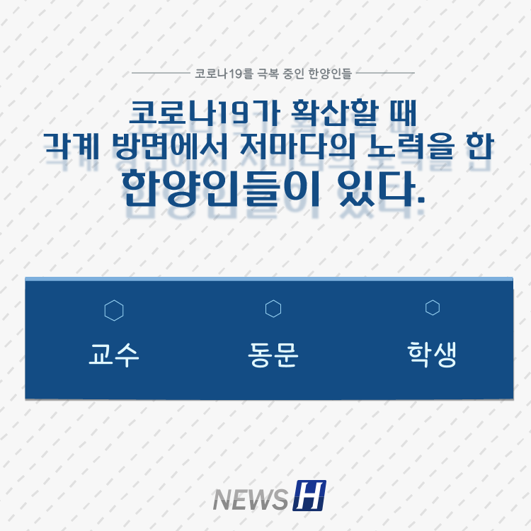각계 방면에서 코로나19를 이겨내기 위한 한양인들의 노력 ▲ 카드뉴스의 원본 기사는 아래에서 읽을 수 있습니다 코로나19를 극복 중인 한양인들 배정은 bjo1107@naver.com 다른기사 보기 저작권자 © 뉴스H 무단전재 및 재배포 금지 당신만 안 본 뉴스 [포토스토리] "AI 시대 해답은 브랜딩", 오세훈 서울시장의 경영학 특강 현장 Into the Creation 2025, 창작자들의 꿈에 날개를 이찬규 학생, 사이버·우주 융합연구로 2025 사이버안보논문공모전 대상 수상 한양대, '2026 QS 지속가능성 순위' 세계 161위, 국내 4위 기록 해커톤에서 인턴십까지, 현대차 사내 스타트업에 다녀오다 [창업지원단 인턴십 경험기] [포토스토리] 한양 속에 사회혁신을 품다, SSIR 먼슬리 콜로키움 현장 행복은 좋은 경험의 ‘빈도’에서, 서은국 교수와 함께한 한양인의 힐링콘서트 현장 [포토스토리] "AI 시대 해답은 브랜딩", 오세훈 서울시장의 경영학 특강 현장 댓글삭제 삭제한 댓글은 다시 복구할 수 없습니다. 그래도 삭제하시겠습니까? 비밀번호 닫기 기사 댓글 1 댓글 접기 로그인 후 이용 가능합니다. 댓글 내용입력 비회원 로그인 이름 비밀번호 댓글 내용입력 댓글쓰기 계정을 선택하시면 로그인·계정인증을 통해 댓글을 남기실 수 있습니다. 회원 로그인 비회원 글쓰기 이름 비밀번호 자동등록방지 로그인 옵션 창닫기 댓글목록 최신순 추천순 욕설, 타인비방 등의 게시물은 예고 없이 삭제 될 수 있습니다. 폰트 2020-04-28 12:53:37 더보기 삭제하기 카드뉴스에 쓰인 폰트가 예전 한양대 UI에 쓰이던 폰트인것 같은데 폰트 이름이 뭔지 알 수 있을까요? 기획기사 [포토스토리] "AI 시대 해답은 브랜딩", 오세훈 서울시장의 경영학 특강 현장 Into the Creation 2025, 창작자들의 꿈에 날개를 해커톤에서 인턴십까지, 현대차 사내 스타트업에 다녀오다 [창업지원단 인턴십 경험기] [포토스토리] 한양 속에 사회혁신을 품다, SSIR 먼슬리 콜로키움 현장 행복은 좋은 경험의 ‘빈도’에서, 서은국 교수와 함께한 한양인의 힐링콘서트 현장 [카드뉴스] '한양대학교 SDGs? 알고 보니 내 일상 속에 있었다!' 1편