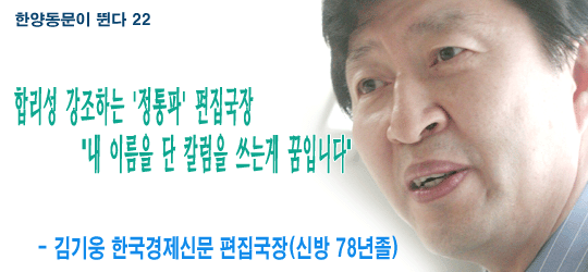 김기웅 편집국장은 1971년 본교 신문방송학과에 입학해서 78년에 졸업했다. 졸업과 동시에 내외경제신문에 입사했으며 80년부터 한국경제신문으로 자리를 옮겨 지금까지 근무하고 있다. 그는 김영삼 대통령 시절 정치부 차장으로 청와대에 출입하기도 했으며 산업부장, 편집국 부국장, 광고국장 등을 역임했다. 올해 4월부터 편집국장으로 근무하고 있는 김 동문은 본교 언론인들의 모임인 '한양언론인회'의 총무로도 활동 중이다.