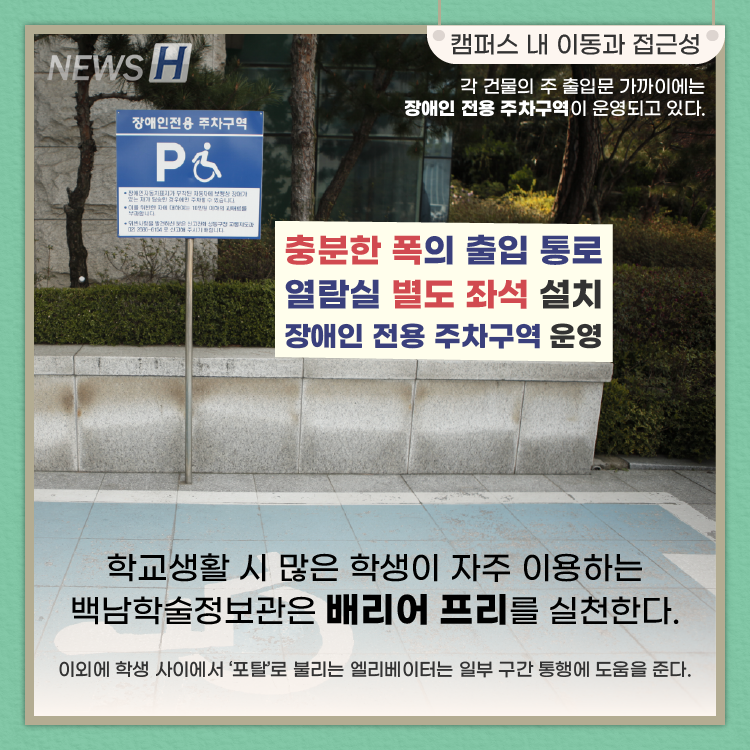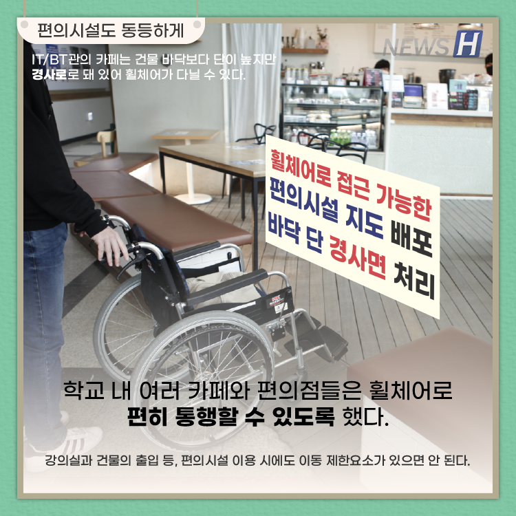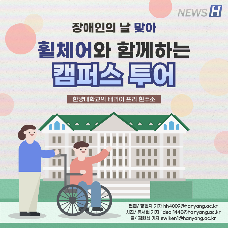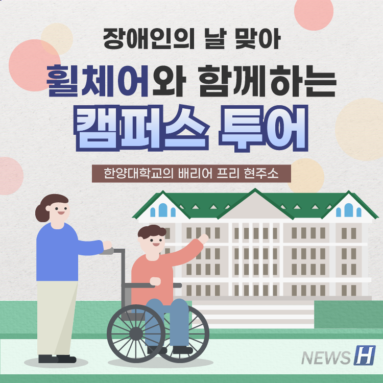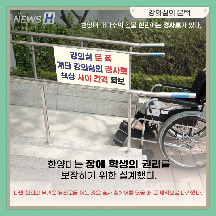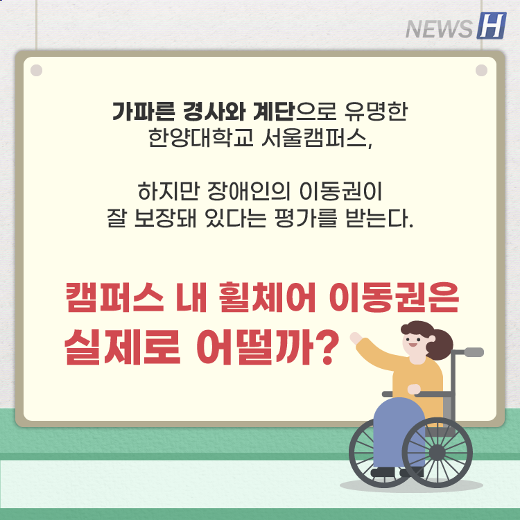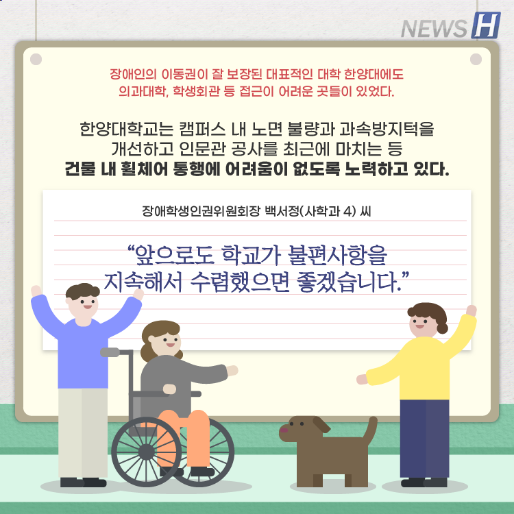 한양대학교의 배리어 프리 현주소 ▲ 카드뉴스의 원본 기사는 아래에서 읽을 수 있습니다장애인의 날 맞아 휠체어와 함께하는 캠퍼스 투어 키워드 '한양위키' 키워드 보기 #배리어 프리 #장애학생인권위원회 #장애학생지원센터 #한양대 장인위 #휠체어 장현지 hh4009@naver.com 다른기사 보기 저작권자 © 뉴스H 무단전재 및 재배포 금지 당신만 안 본 뉴스 [포토스토리] "AI 시대 해답은 브랜딩", 오세훈 서울시장의 경영학 특강 현장 Into the Creation 2025, 창작자들의 꿈에 날개를 이찬규 학생, 사이버·우주 융합연구로 2025 사이버안보논문공모전 대상 수상 한양대, '2026 QS 지속가능성 순위' 세계 161위, 국내 4위 기록 해커톤에서 인턴십까지, 현대차 사내 스타트업에 다녀오다 [창업지원단 인턴십 경험기] [포토스토리] 한양 속에 사회혁신을 품다, SSIR 먼슬리 콜로키움 현장 행복은 좋은 경험의 ‘빈도’에서, 서은국 교수와 함께한 한양인의 힐링콘서트 현장 2025 중앙일보 대학평가 서울 3위, ERICA 13위 댓글삭제 삭제한 댓글은 다시 복구할 수 없습니다. 그래도 삭제하시겠습니까? 비밀번호 닫기 기사 댓글 0 댓글 접기 로그인 후 이용 가능합니다. 댓글 내용입력 비회원 로그인 이름 비밀번호 댓글 내용입력 댓글쓰기 계정을 선택하시면 로그인·계정인증을 통해 댓글을 남기실 수 있습니다. 회원 로그인 비회원 글쓰기 이름 비밀번호 자동등록방지 로그인 옵션 창닫기 기획기사 [포토스토리] "AI 시대 해답은 브랜딩", 오세훈 서울시장의 경영학 특강 현장 Into the Creation 2025, 창작자들의 꿈에 날개를 해커톤에서 인턴십까지, 현대차 사내 스타트업에 다녀오다 [창업지원단 인턴십 경험기] [포토스토리] 한양 속에 사회혁신을 품다, SSIR 먼슬리 콜로키움 현장 행복은 좋은 경험의 ‘빈도’에서, 서은국 교수와 함께한 한양인의 힐링콘서트 현장 [카드뉴스] '한양대학교 SDGs? 알고 보니 내 일상 속에 있었다!' 1편
