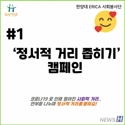 이번 캠페인에서 희망한대 단원들은 우선 비대면 봉사활동을 실천하고, 해당 봉사활동의 참여 방법 및 후기를 작성하여, 다른 학생들에게도 해당 봉사활동을 장려하는 방식을 진행했다. 비대면 봉사활동 릴레이 및 추천 게시글은 매주 희망한대 SNS를 통하여 지속적으로 업로드될 예정이다.