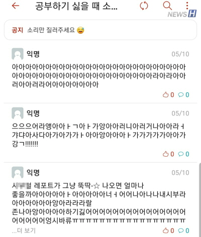 시험 기간에 많은 시험 범위와 과제들로 인해 스트레스를 받는 학생들도 있다. 이때를 위하여 그간의 참았던 울분을 표출할 수 있는 '공부하기 싫을 때 소리 지르는 게시판'이 있다.