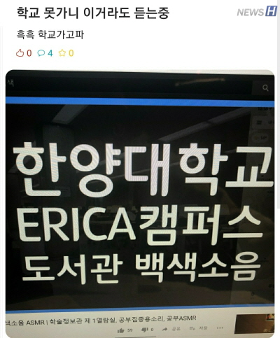 해당 영상은 '한양대학교 ERICA 도서관 백색소음'으로 학술정보관 제1열람실 소리를 녹음한 영상이다. 영상을 통해 현장에 있는 듯한 느낌을 받으며 공부에 집중하려는 학생의 노력을 엿볼 수 있었다.