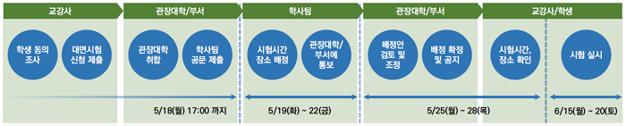 대면시험을 실시하기 위해서는 다음 절차를 따라야 한다. 우선 교강사는 강좌별로 학생들의 동의를 구해야 한다. 이때 익명 방식 등을 최대한 활용해 학생의 자유로운 의사표현이 보장되어야 한다. 조사가 완료되면 대면시험 승인 신청서를 작성해 강좌 관장대학에 신청하면 된다. 관장대학은 이를 취합하고 1차 승인하여 학사팀으로 5월 18일까지 공문 제출해야 한다.