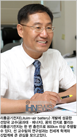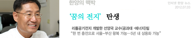 현재 차량에 사용되고 있는 ‘리튬이온전지’가 상용화 된지 20년. ‘납 축전지’는 개발된 지 200년이 지났지만 전지개발의 속도는 더디다. 그만큼 새로운 기술혁신이 어렵기 때문이다. 이 가운데 꿈의 전지가 탄생했다. 우리대학 선양국 교수(공과대·에너지)팀이 ‘리튬공기전지(Lithuim-air battery)’ 개발에 성공한 것이다. 이는 전지 개발사의 한 축이 바뀌는 순간이자 새로운 역사의 시작을 알리는 신호탄이다.