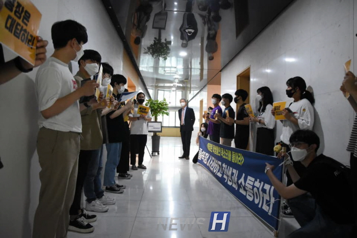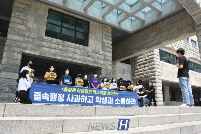 현장에서 비상대책위원장과 교육정책위원장은 총장을 만나 '코로나19 관련 학교 본부의 졸속 행정처리 규탄 성명서'를 전달했으며, 오전 10시부터 시작된 총장실 앞 피케팅은 오후 5시까지 진행되었다. 사자상 앞에는 농성을 위한 천막이 설치되었으며, 학생들은 의견을 적은 종이를 본관 앞 출입문에 부착하기도 했다. 현재 대학 본부는 9일 있을 감염병관리위원회 회의를 거쳐 10일 답변을 전달하겠다는 입장이다.