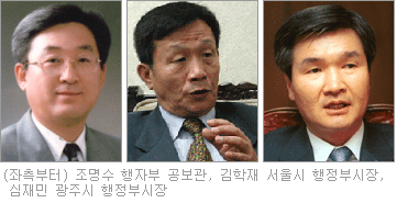 조명수 공보관은 내무부와 대통령비서실을 거쳐 강원도 기획담당관, 철원군수, 지방자치기획단장, 제2건국위 총괄심의관 등을 역임했다. 1997년 LA 내무담당영사로 파견을 나가면서 오디오에 관심을 갖기 시작해, 지난 99년에는 직접 진공관 엠프를 제작했을 만큼 음악에 조예가 깊다. 최근 차관 인사에서 내부 승진이 잇따라 1급으로의 승진이 조심스럽게 점쳐지는 인물이기도 하다. 김학재 서울시 행정부시장은 기술고시를 통해 관계에 입문한 케이스로 서울의 도시계획 분야에서만 30년을 근무한, 자타가 공인하는 도시계획 엔지니어다. 도시정비국 도시계획과장과 도시계획국장, 지하철건설본부장을 역임했고 지난 96년 차관급인 서울시 행정부시장에 취임했다. 지하철 1호선부터 8호선까지 서울시 지하철 건설의 시작과 끝을 함께 한 인물로도 잘 알려져 있다. 월드컵을 앞두고 상암동 월드컵경기장건설본부단장을 맡아, 이른바 '난지도 프로젝트'를 완성시킨 책임자이기도 하다. 중앙공무원교육원 교수부장을 역임했던 심재민 광주광역시 행정부시장은 뛰어난 학문적 능력을 겸비한 관료로 평가받는다. 내무부 공기업과장과 재정경제과장, 행자부 지역정보화재단 사무국장, 국가전문행정연수원 연수부장 등을 두루 역임했다.