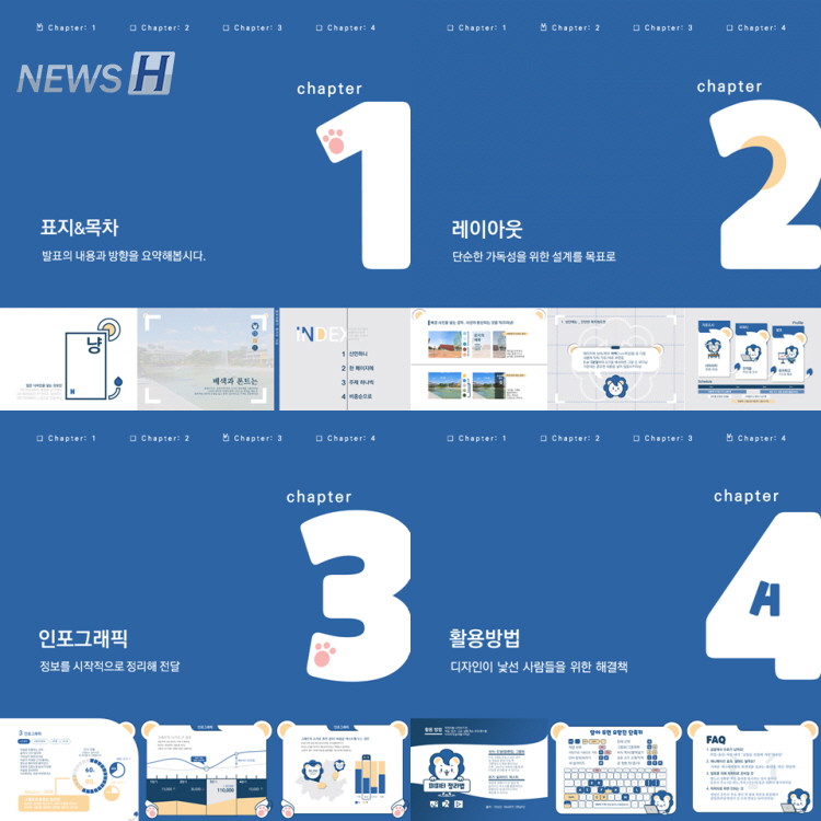 템플릿 구성은 하냥이 캐릭터 디자인과 함께 표지 및 목차, 레이아웃, 인포그래픽, 활용 방법 총 4가지 파트로 구성되었다. 각 파트에는 파워포인트 제작에 도움이 되는 중요 내용을 포함하여 제작되었다.
