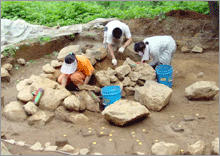 며칠동안 비가 내린 탓에 그 동안 발굴해놨던 자리가 흙탕물로 엉망이 됐다. 하지만 문인과 발굴팀은 힘든 일을 마다하지 않고 발굴작업에 몰두하고 있다. 매일 아침, 저녁으로 올랐다가 내려 와야하는 산길도 사람들의 발길이 닿지 않던 곳이라 키 큰 잡초와 바위들 투성이다. 게다가 모기와 날벌레들은 한낮에도 사람들을 가만히 놔두지 않는다. 보통 인부들이 와서 큰 작업은 해주지만 세밀한 작업은 8명 정도의 학생들과 연구원들의 몫이다. 힘들고 지치지만 한번 발을 들이면 빠져나갈 수 없는 매력이 있다고 하는 김소형(4) 양은 "다른 전공 학생들 중에 땅파면서 공부하는 사람들이 어디 있겠어요? 우리들은 낮에 땅파고 밤새면서 연구하고 공부해야하니까 그만큼 더 힘들지만 그 보람은 이루 말할 수 없다."라며 발굴작업에 열심이다.