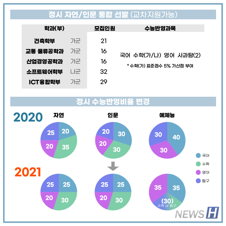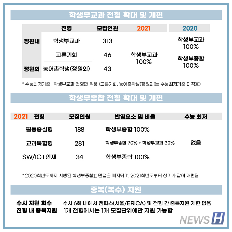 한양대학교 ERICA캠퍼스 입학처는 2021학년도 신입학정보를 발표했다. 2021학년도 수시와 정시 모집인원은 총 1838명으로 작년 1830명 대비 8명을 증원했다. 수시 수능최저기준과 정시 수능반영비율 변경 등의 내용을 담았다.