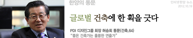 미네소타 법정에는 건축 자재 중 하나인 대리석 여러 개가 나란히 벽면에 붙어있다. 이 대리석은 장식을 위한 것이 아니라 햇빛을 투과하기 위한 것. 위화감과 어두움을 줄 수 있는 법정에 따뜻한 온기를 불어넣고 싶었던 건축가 팀의 바람이 담겨있는 것이다. 이 건축가 팀의 리더는 바로 PDI 디자인그룹 최고 경영자 허승회 동문(건축.64). 그는‘사람이 사는 곳은 항상 따뜻해야 한다’는 스승의 말에 따라 건축에 따뜻한 인간미를 부여하고 있다. 미네소타 법정을 비롯해 미네소타 주에 위치한 여러 공공건물, 칠레 미국 대사관, 부산 벡스코 등을 설계한 허 동문의 건축 인생 41년의 발자취를 인터넷한양이 따라가봤다.