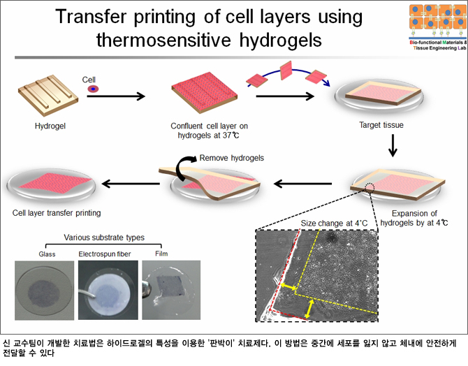 이러한 문제점을 해결하기 위해 신 교수가 개발한 방법은 ‘감열성 하이드로겔을 통한 세포전달이식법’. 이는 우리가 잘 알고 있는 ‘판박이 스티커’에서 착안한 것이다. 어릴 적 판박이 스티커를 집 창문이나 벽에 붙여본 기억이 누구나 있을 것이다. 종이(혹은 비닐)를 사물에 대고 잘 문지른 뒤 종이를 떼어내면 도안만 사물에 붙어있게 된다. 신 교수는 이 원리에 착안, ‘하이드로겔(Hydrogel)’을 사용한 판박이를 생각해냈다. 신 교수가 개발한 방법은 하이드로겔을 재료로 패치를 만들고 그 위에 세포를 배양, 세포가 부착된 패치를 신체부위에 붙이는 방식이다. 하이드로겔은 물에 잘 분산되는 겔(gel)로, 흡착성이 뛰어나고 온도에 따라 그 형태를 조절할 수 있어 다방면에서 활용되고 있다. 패치 위에 식염수를 부으면 하이드로겔은 떨어져나가고 세포만 신체부위에 남게 된다. 세포를 잃지 않고 조직 재생이 가능한 것이다.
