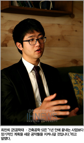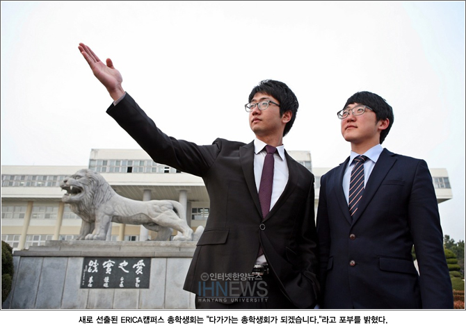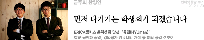 새로운 ERICA캠퍼스 총학생회가 등장했다. 단선으로 진행된 선거에서, 지난 21일 개표 결과 ‘휴맨(HYUman)’ 선거운동본부가 전체 투표자의 72%의 찬성으로 당선됐다. 총학생회장 당선자 최찬희 군(공학대 ·건축공학 5)과 부회장 당선자 이상근 군(공학대·기계공학 2)은 입을 모아 “다가가는 총학생회가 되겠습니다”라고 포부를 밝혔다. 새로운 총학생회가 꿈꾸는 학교는 어떤 모습인지 인터넷한양이 만나봤다.