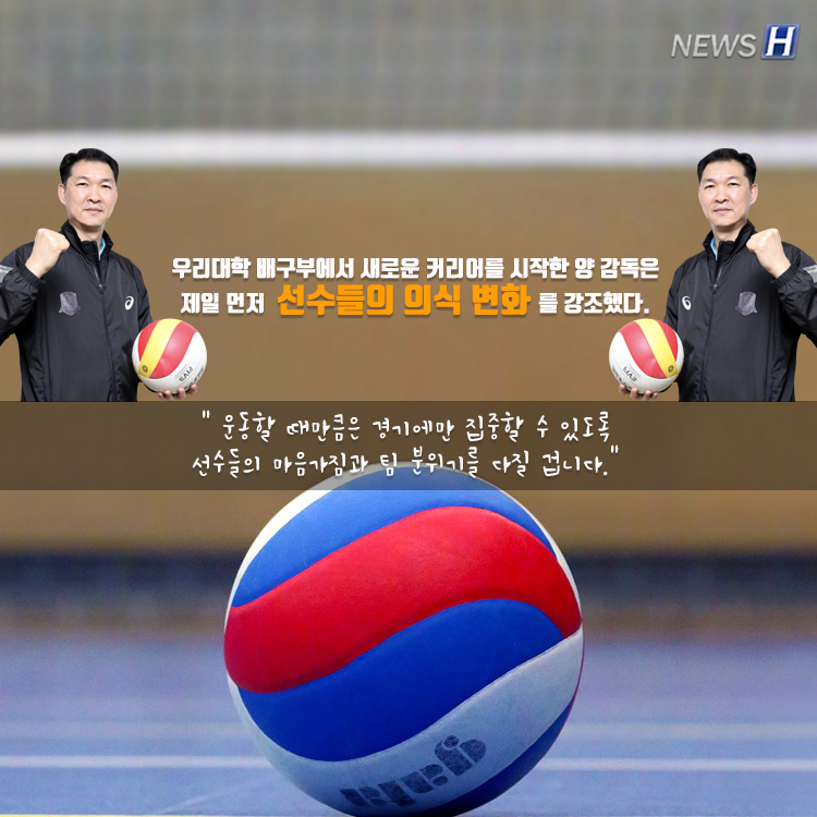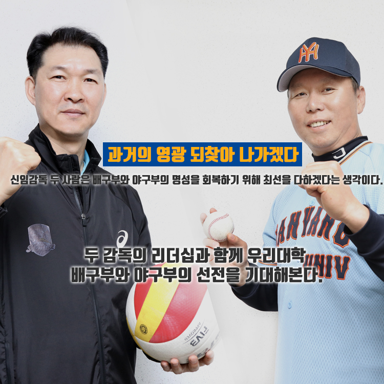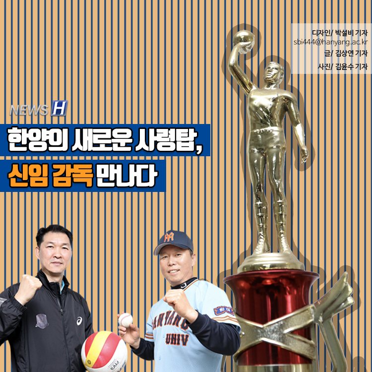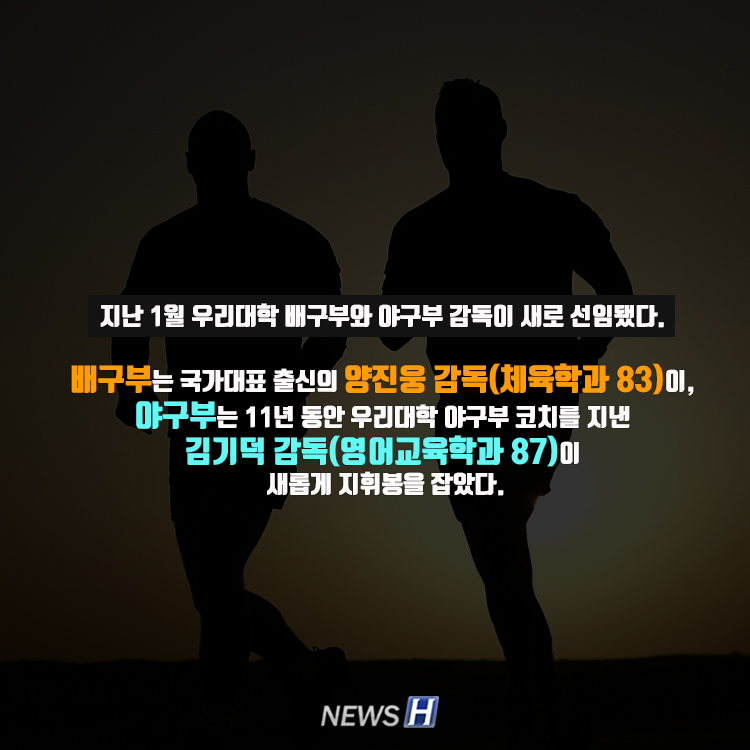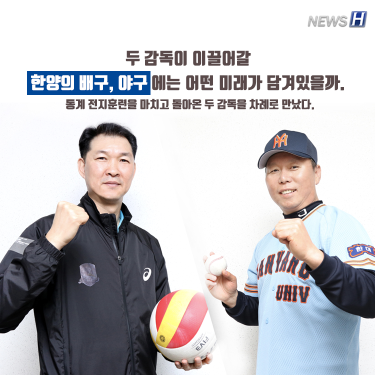 배구부 양진웅 감독, 야구부 김기덕 감독 ▲ 카드 뉴스의 원본 기사는 아래에서 읽을 수 있습니다 - 한양의 새로운 사령탑, 신임 감독 만나다 박설비 sbi444@hanyang.ac.kr 다른기사 보기 저작권자 © 뉴스H 무단전재 및 재배포 금지 당신만 안 본 뉴스 [포토스토리] "AI 시대 해답은 브랜딩", 오세훈 서울시장의 경영학 특강 현장 Into the Creation 2025, 창작자들의 꿈에 날개를 이찬규 학생, 사이버·우주 융합연구로 2025 사이버안보논문공모전 대상 수상 한양대, '2026 QS 지속가능성 순위' 세계 161위, 국내 4위 기록 해커톤에서 인턴십까지, 현대차 사내 스타트업에 다녀오다 [창업지원단 인턴십 경험기] [포토스토리] 한양 속에 사회혁신을 품다, SSIR 먼슬리 콜로키움 현장 행복은 좋은 경험의 ‘빈도’에서, 서은국 교수와 함께한 한양인의 힐링콘서트 현장 [포토스토리] "AI 시대 해답은 브랜딩", 오세훈 서울시장의 경영학 특강 현장 댓글삭제 삭제한 댓글은 다시 복구할 수 없습니다. 그래도 삭제하시겠습니까? 비밀번호 닫기 기사 댓글 0 댓글 접기 로그인 후 이용 가능합니다. 댓글 내용입력 비회원 로그인 이름 비밀번호 댓글 내용입력 댓글쓰기 계정을 선택하시면 로그인·계정인증을 통해 댓글을 남기실 수 있습니다. 회원 로그인 비회원 글쓰기 이름 비밀번호 자동등록방지 로그인 옵션 창닫기 기획기사 [포토스토리] "AI 시대 해답은 브랜딩", 오세훈 서울시장의 경영학 특강 현장 Into the Creation 2025, 창작자들의 꿈에 날개를 해커톤에서 인턴십까지, 현대차 사내 스타트업에 다녀오다 [창업지원단 인턴십 경험기] [포토스토리] 한양 속에 사회혁신을 품다, SSIR 먼슬리 콜로키움 현장 행복은 좋은 경험의 ‘빈도’에서, 서은국 교수와 함께한 한양인의 힐링콘서트 현장 [카드뉴스] '한양대학교 SDGs? 알고 보니 내 일상 속에 있었다!' 1편