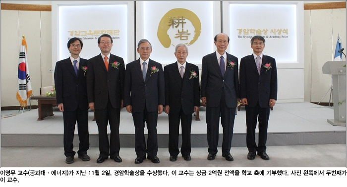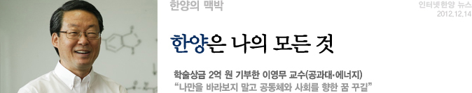 이영무 교수(공과대·에너지)가 지난 9월, 대한민국 최대 규모의 학술상인 ‘경암학술상’ 공학부문 수상자로 선정됐다. 경암학술상은 경암교육문화재단이 시상하는 국내 최대 규모의 학술상으로 상금은 2억원이다. 그리고 지난 11월, 이 교수는 학술상금 전액인 2억원을 우리대학에 기부했다. 이 교수는 “학교의 발전을 위해 조금이나마 힘을 보태고 싶다”며 기부의사를 밝혔고 “나의 모든 것이라 할 수 있는 ‘한양’에 기쁜 마음으로 기부할 수 있어 감사하다”는 소감을 전했다.