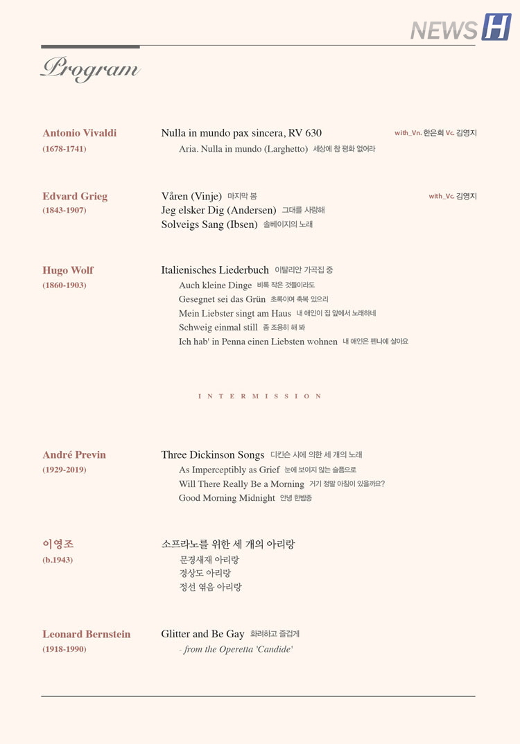 이어 15분의 인터미션을 거쳐 2부에서는 앙드레 프레빈의 '디키슨 시에 의한 세 개의 노래', 이영조의 '소프라노를 위한 세 개의 아리랑', 그리고 레너드 번스타인의 '화려하고 즐겁게'를 끝으로 공연이 마무리될 예정이다.