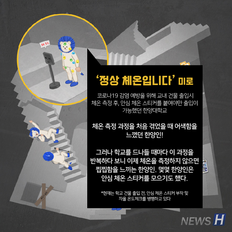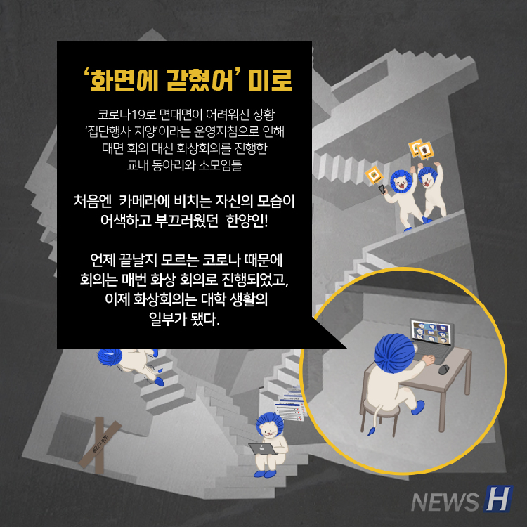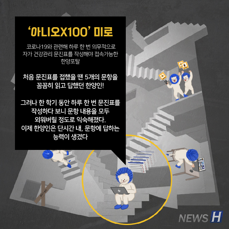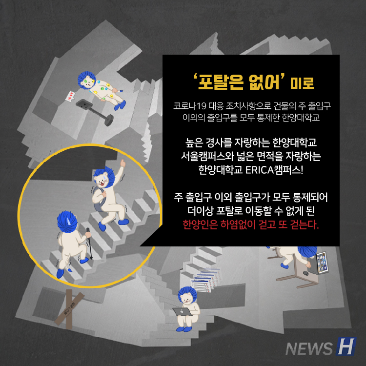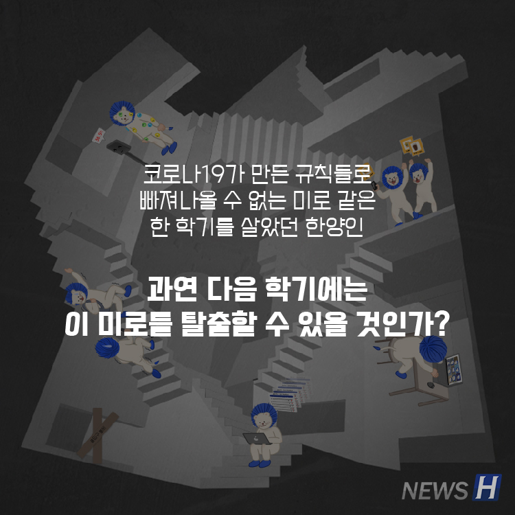 한양대는 코로나바이러스감염증-19 예방을 위해 학사 일정 변동, 방역 수칙 준수 등 여러 대응 조치를 해왔다. 한양인은 이전에 없던 규칙들로 혼란을 겪었지만, 지나가 버린 시간만큼 익숙함을 느낀다. 코로나19로 반복된 한양인의 일상을 미로에 비유해봤다. 지난 한 학기, 한양인의 미로 같은 일상은 어떤 모습이었을까?
