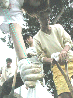 수활 3일째, 학생들이 향한 곳은 강릉시 유산동의 주택가. 이번 태풍으로 축대가 무너진 이 곳 역시 상황은 별로 좋지 않았다. 축대를 쌓는 작업은 우선 모래를 삽으로 퍼서 포대자루에 넣은 다음 그것을 땅이 무너져 내린 곳에 차곡차곡 쌓아 높이는 것이었다. 5, 6 미터가 넘는 높이를 채우기 위해 진흙으로 엉망이 된 미끄러운 길을 따라 모래주머니를 날라야 하는 힘든 작업이었다. 수해를 입은 주민 김성호(61) 씨는 "집 앞마당이 다 무너져버려 코앞이 낭떠러지가 됐다. 그런데 이렇게 학생들이 와서 축대를 쌓아줘 이루 말할 수 없이 고맙다."며 학생들에게 감사를 전했다. 김효경(국제문화대·일문3) 양은 "수업을 못들은 것은 아쉽지만 그보다 더 중요한 일인 것 같아 참여하게 됐다."며 "허리도 아프고 일도 힘들지만 축대가 쌓이는 것을 보면 마음이 뿌듯해진다."라고 수활에 참여한 감회를 밝혔다.