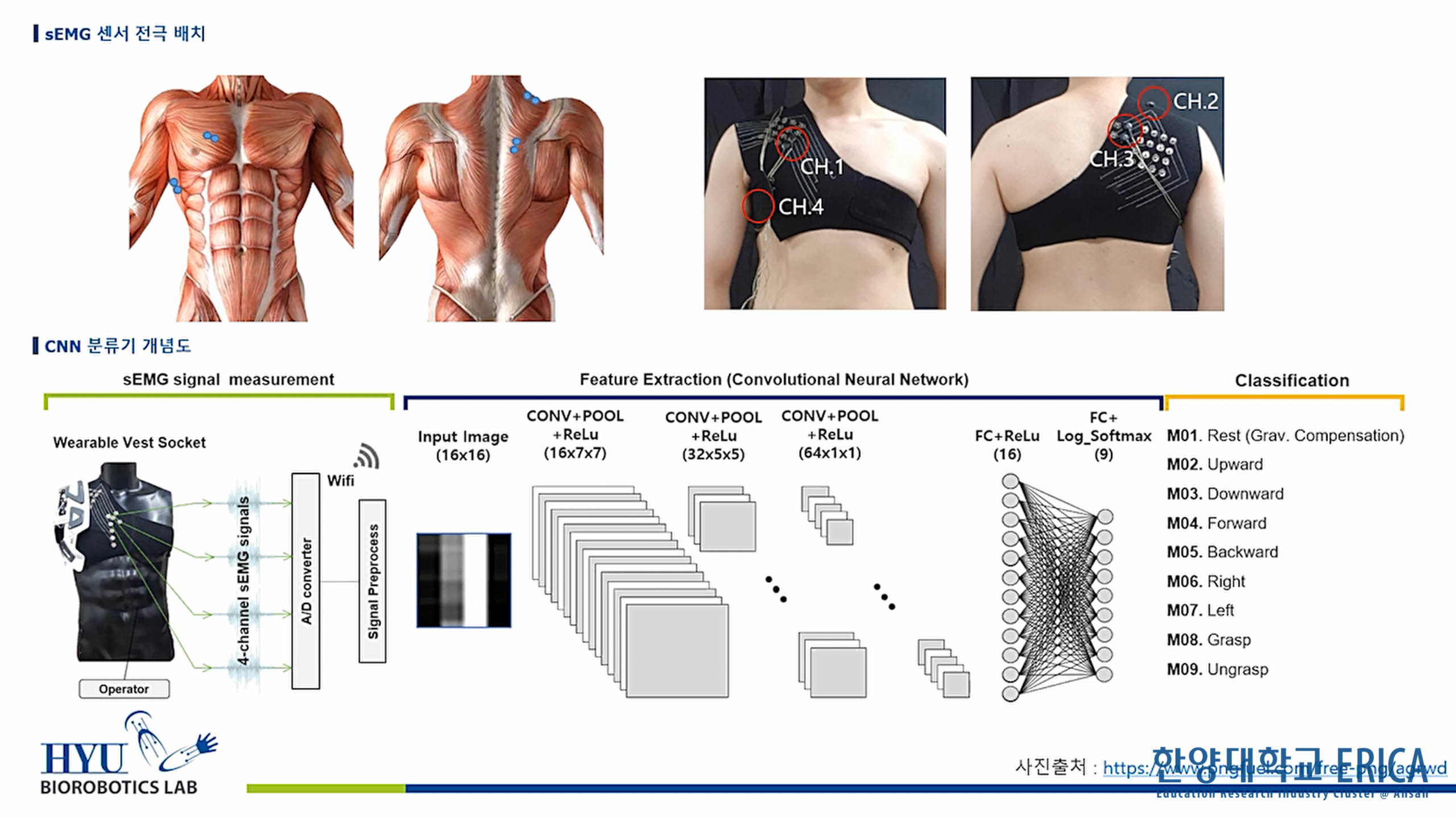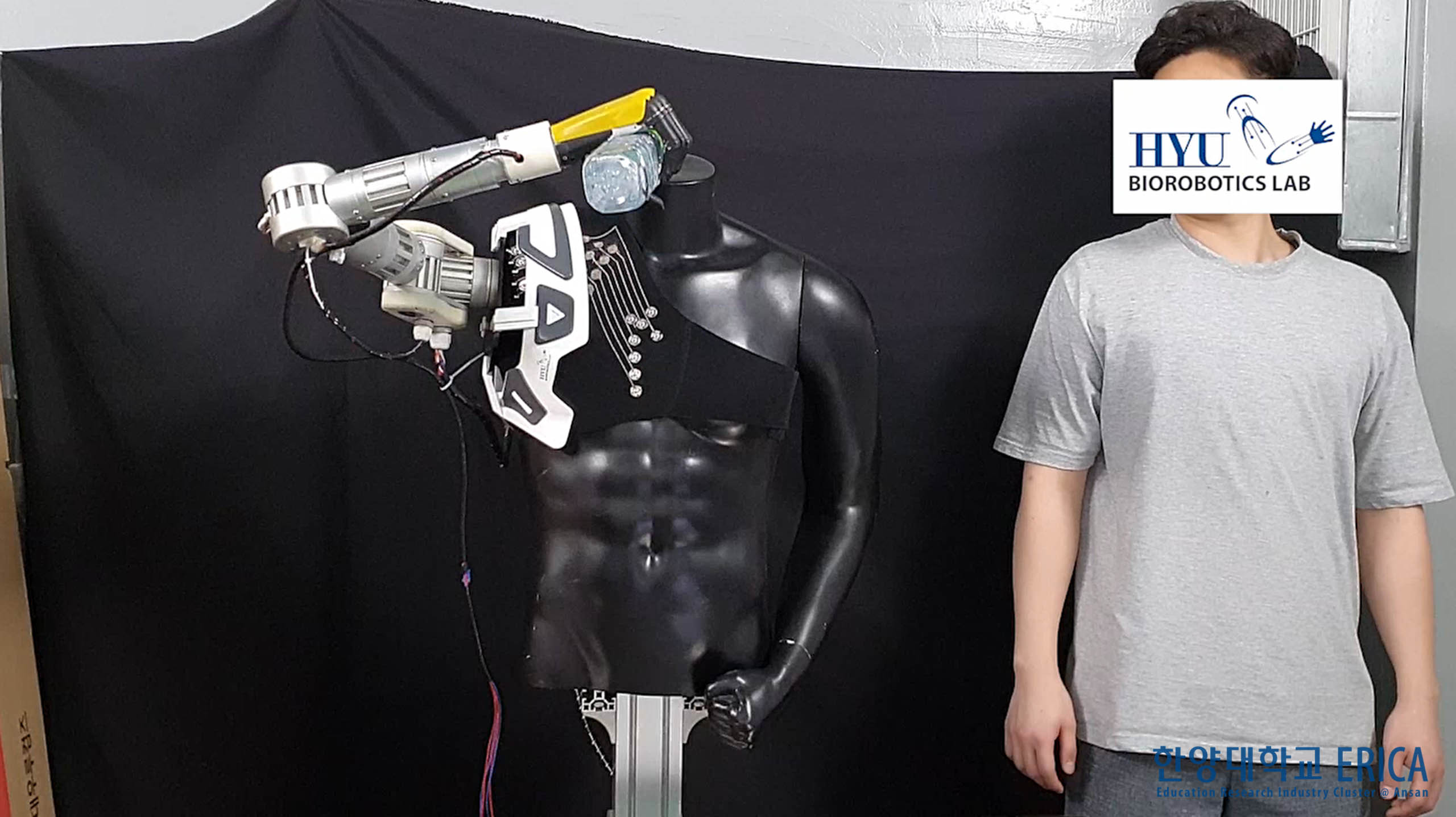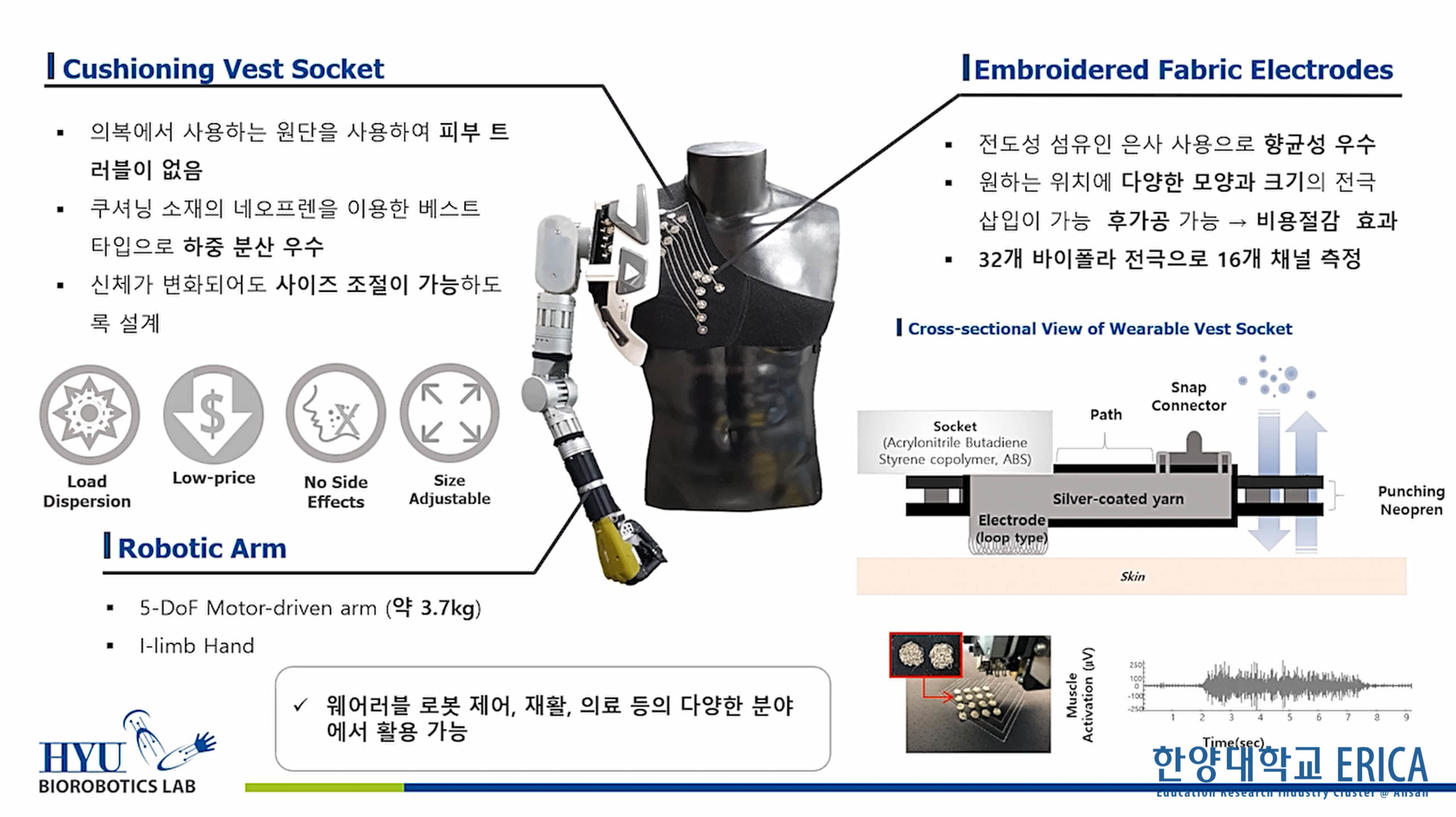 한양대 바이오로보틱스 연구실은 유연한 소재와 견고한 소재를 혼합한 웨어러블 sEMG(surface EMG) 측정용 베스트(vest)와 기계학습 알고리즘을 이용한 로봇 팔을 개발했고 어깨 견착을 위해 경량화에 중점을 두고, 근전도 신호를 통해 로봇 팔이 제어되도록 설계됐다. 이렇게 설계된 스마트 웨어러블 로봇은 제어, 재활, 의료 등 다양한 분야에서 활용이 가능하다.