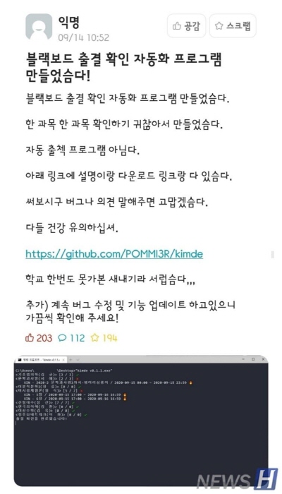 '블랙보드 출결 확인 자동화 프로그램 만들었슴다!'라는 제목으로 올라온 게시글에서 모 학생은 블랙보드 사이트 내에서 과목별로 출결을 확인해야 하는 수고를 덜고자 만들었다며 개발 동기를 밝혔다.