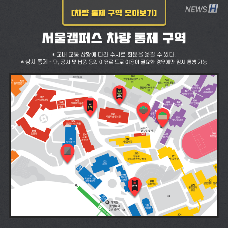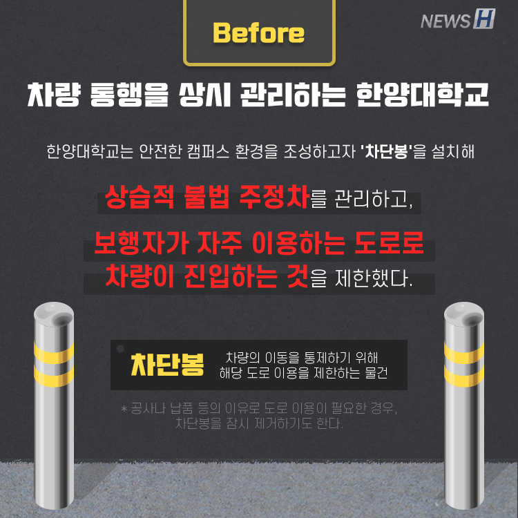 한양대 서울캠퍼스는 한양인의 안전을 위해 캠퍼스 내 차량 통행을 상시 관리하고 있다. 보행자가 자주 이용하는 도로의 차량 진입을 제한하고 동시에 상습적 불법 주정차도 함께 관리한다. 본래 차단봉을 통해 차량을 통제하는데, 올해 6월부터 캠퍼스 조경 및 미관을 고려해 각 통제 구역에 화분과 안내표지판을 설치하고 있다. 캠퍼스 미관까지 생각한 한양대 서울캠퍼스의 차량 통제 방법과 구역을 알아봤다.