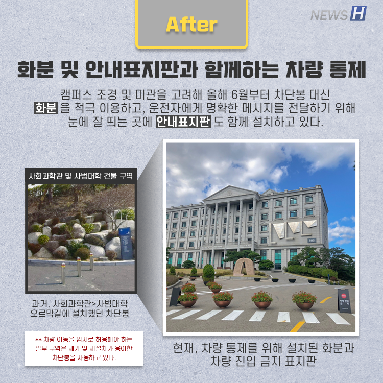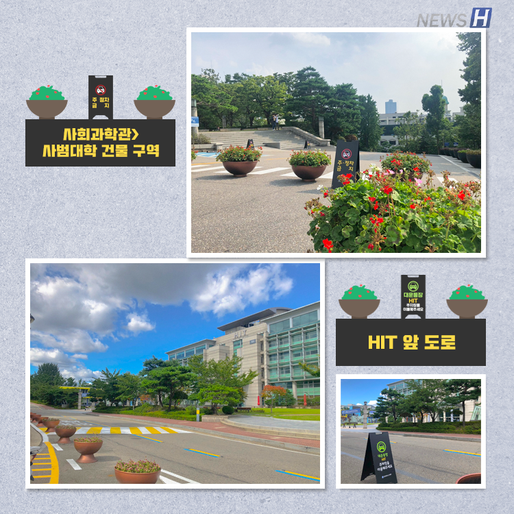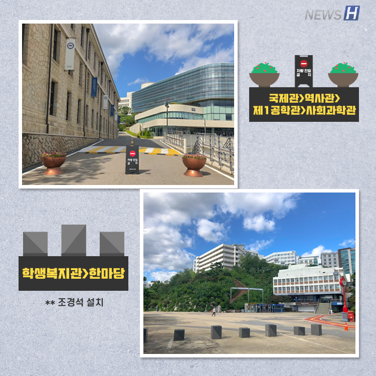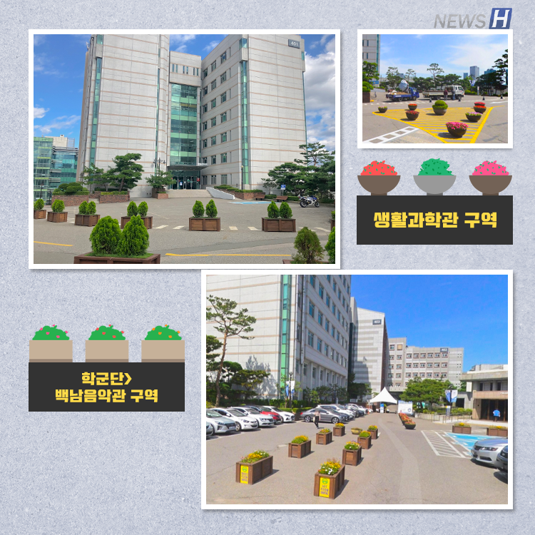 안내표지판과 화분으로 차량 통행 관리 중… 차량 통제와 함께 캠퍼스 조경까지 고려해