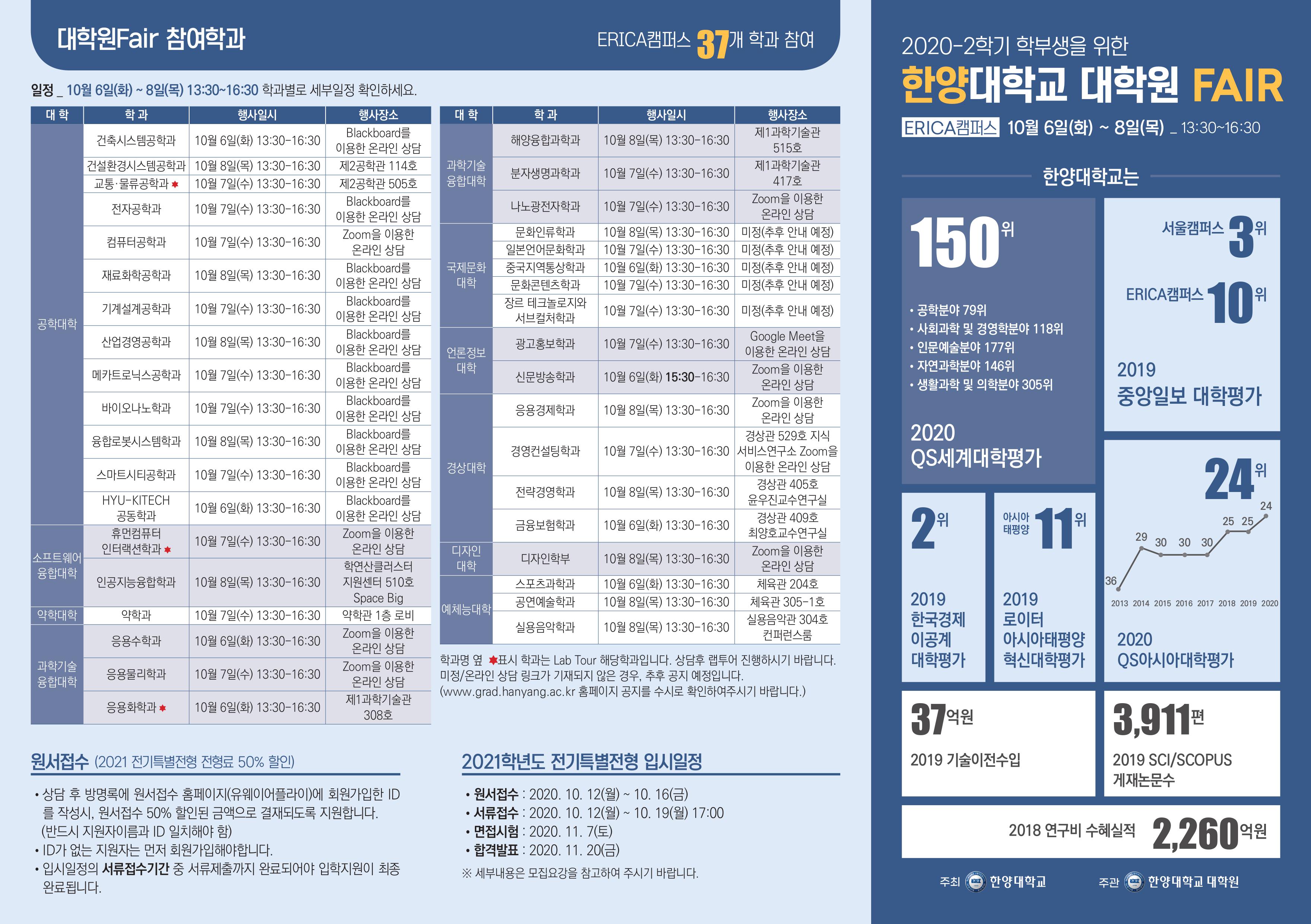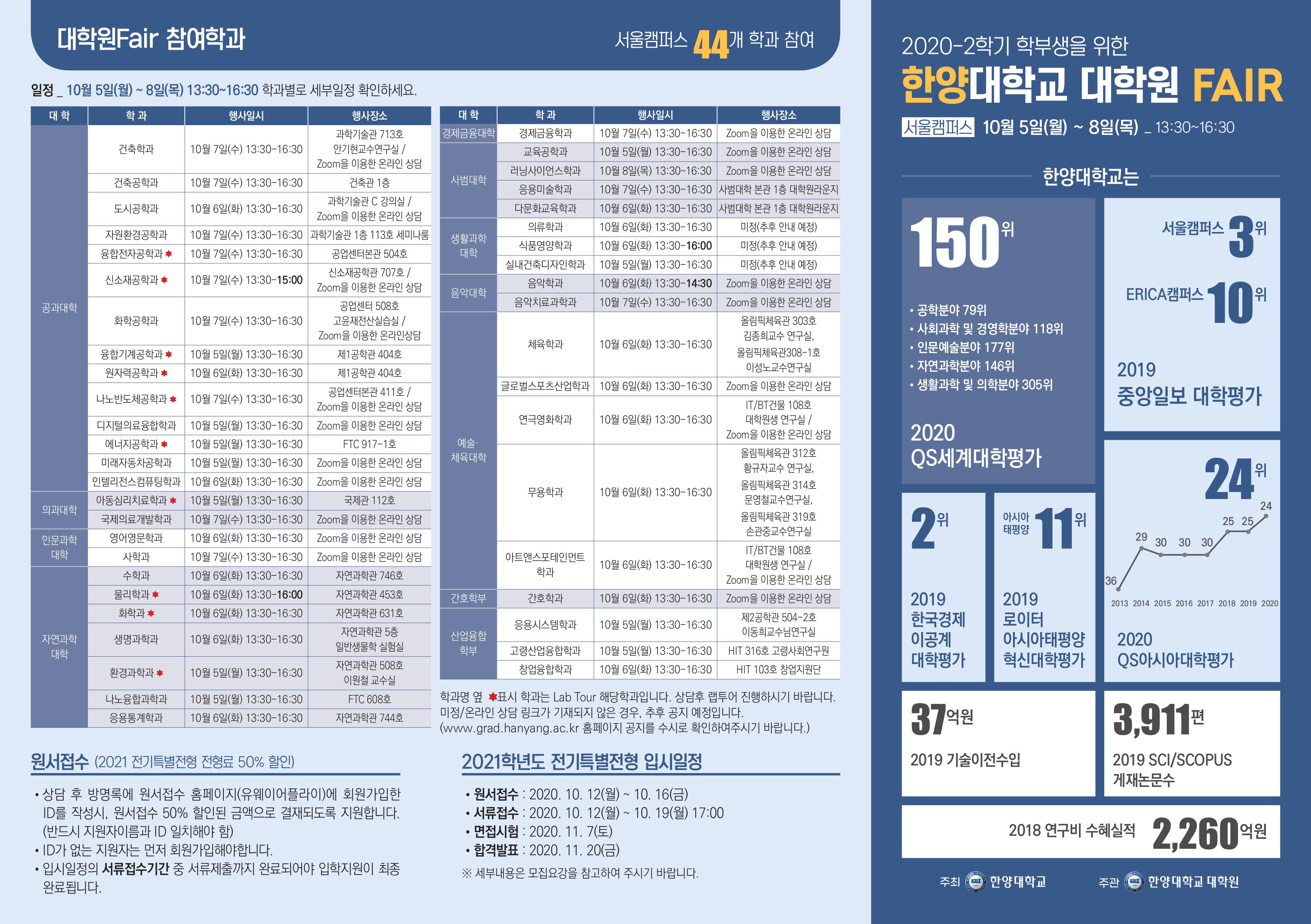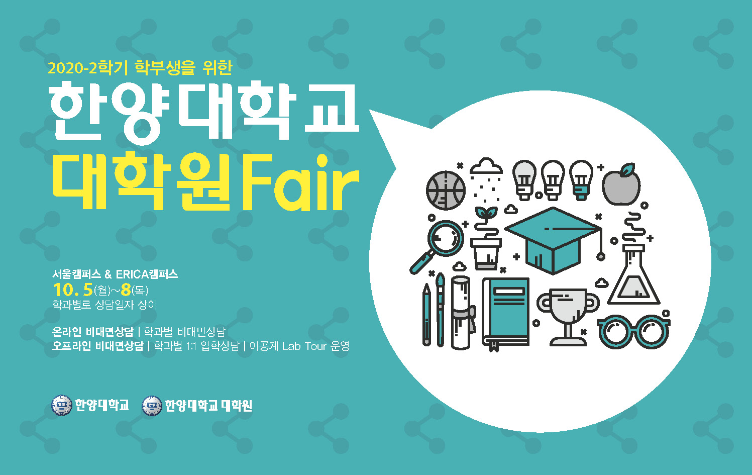 한양대가 주최하고 한양대학교 대학원이 주관하는 '2020학년도 2학기 학부생을 위한 대학원 페어(Fair)'가 서울캠퍼스와 ERICA캠퍼스에서 각각 개최된다. 두 캠퍼스 모두 10월 5일부터 8일까지 온라인 비대면상담과 오프라인 비대면상담으로 나뉘어 진행된다.