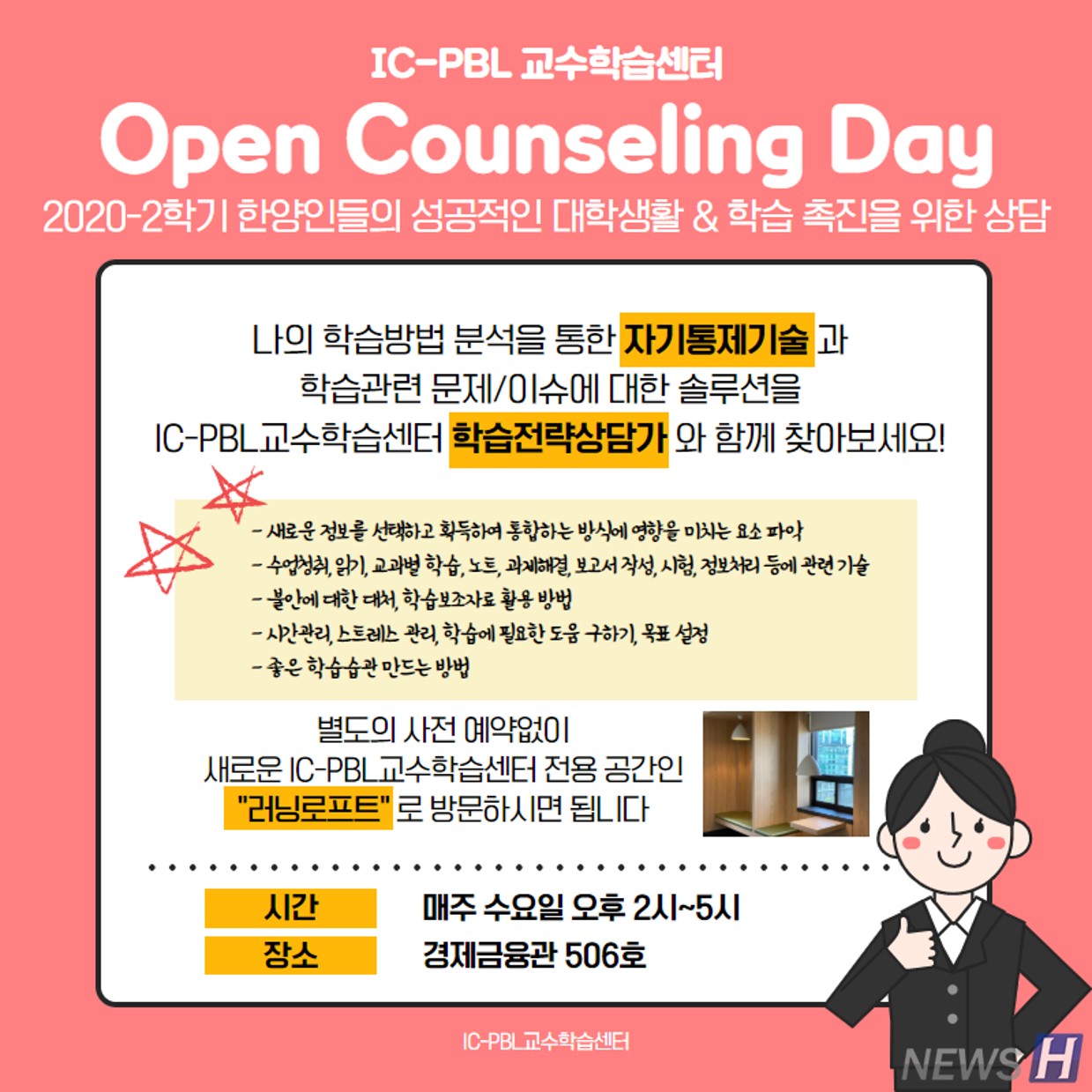 상담을 원한다면, 별도의 사전 예약 없이 IC-PBL교수학습센터 전용 공간인 ‘러닝로프트’로 방문하면 된다. 운영 시간은 매주 수요일 오후 2시에서 5시까지이고, 장소는 경제금융관 506호이다.