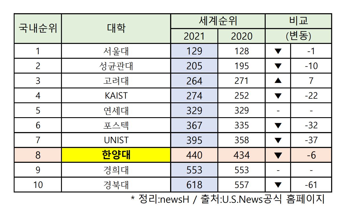 미국 시사주간지 US 뉴스 앤드 월드리포트(이하 US뉴스)가 '2021 세계대학순위(Best Global Universities Rankings)'를 발표했다. 한양대는 세계 440위, 국내 8위를기록했다.