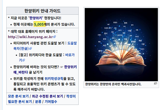 한양대학교의 온라인 백과사전을 표방하고 작년 2019년 11월 1일 오픈한 '한양위키'에 10월 21일 기준 5005개의 문서가 등록됐다. 넘겨주기 문서(단순히 다른 키워드로 변경시켜주는 빈문서)까지 포함하면 약 9800여 개로 거의 1만 개에 이른다. 단순 문서 조회수는 173만 건이 넘는다.