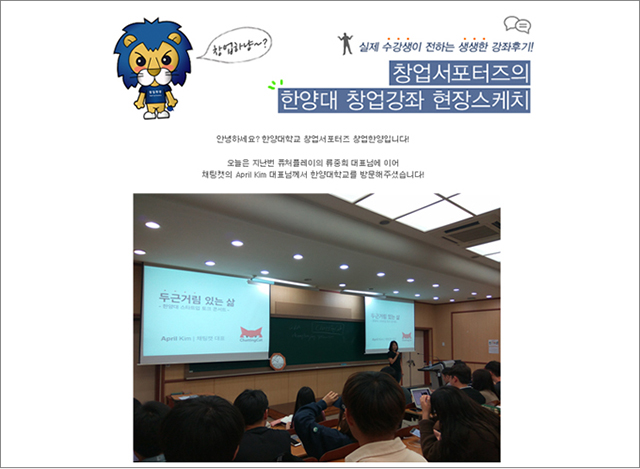 | ▲ 창업한양 2기는 1기가 창업기업 취재와 행사 홍보를 맡은것과 달리 창업강의를 소개하는 활동을 했다. 창업한양을 담당하는 박민정 연구원(글로벌기업가센터)은 "추후 모집할 창업한양 3기는 1기와 2기의 장점을 결합한 활동을 할 예정"이라고 말했다. (출처: 글로벌기업가센터) | ||