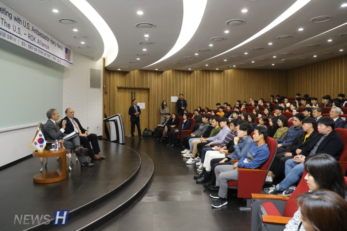 해리 해리스 주한미대사, 한양대서 타운 홀 미팅 진행 학생들과 한미동맹에 대한 자유토론 열어 2019-11-06 한양브리핑 한양대 국제학부는 1일 정몽구 미래자동차연구센터에서 해리 해리스 주한 미국대사와 함께 하는 타운 홀 미팅을 개최했다. 국제학부의 초청으로 한양대를 찾은 해리스 대사는 이날 타운 홀 미팅에서 한미동맹에 대한 자유 토론을 진행했다.