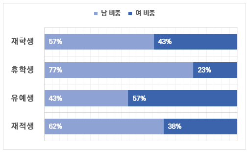 세부적으로 보면 재적생을 구성하는 재학생은 68.3%, 휴학생은 27.5%, 유예생이 4.2% 비율로 되어 있다. 남녀 비율은 남학생과 여학생이 62%와 38%로 나타나 여학생 1명당 남학생 1.62명의 비율임을 알 수 있다.