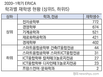 2020년 4월 1일 자 기준 ERICA캠퍼스의 이번 학기 재적생 현황이 나왔다. 재학생은 9176명, 휴학생은 3691명 등 재적생은 총 1만 3427명이다.
