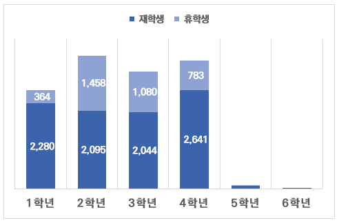 학년별로 보면 재학생 기준 4학년이 28.8%로 가장 높았지만 1~4학년이 고른 분포로 나타났다. 휴학은 2학년이 39.5%로 가장 높게 나타나면서 다른 학년과 큰 차이를 보였다. 휴학생 전체를 보면 남학생이 2848명, 여학생이 843명으로 보아 남학생의 군입대 역향이 큰 것으로 추측된다.