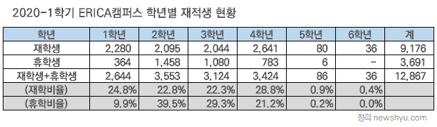 [통계] ERICA캠퍼스 2020년 1학기, 재적생은 1만 3427명