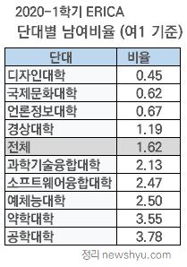 남녀 비율은 전체 인원 기준으로 여학생 1명당 남학생 1.62명으로 나타났지만 단과대학별 편차가 큰 편이다. 디자인대학은 0.45명으로 여학생이 2배 많은 반면, 약학대학과 공학대학은 3.5명을 넘기도 했다.