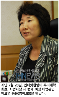“제가 사랑하는 법원, 국민들도 사랑할 수 있도록 만들겠습니다” 우리대학 최초, 사법사상 세 번째 여성 대법관. 박보영 동문(법학.80)이 임명 당시 밝힌 포부다. 대법관은 이 시대의 법과 정의, 양심에 있어 최고의 영예를 상징하는 자리다. 동시에 국민에 대한 막대한 책임감이 주어진다. 법치국가인 대한민국의 법집행자로서, 최고 재판관의 자리에 박 동문이 서있다. ‘사회적 약자’들의 권리 보호를 담아내겠다는 박 동문. 국가의 한 국민으로서, 인터넷한양이 그녀와 마주했다.