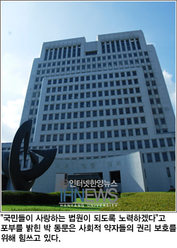 “사실 사법부의 신뢰도 문제는 저희 내부에서도 큰 화두에요. 이는 사법부에 대한 국민들의 신뢰가 크기 때문이라고 생각됩니다. 얼마 전 ‘세계은행’에서 실시한 전 세계 사법부 신뢰도 평가에서 우리나라가 2위를 차지했습니다. 이처럼 우리나라 사법시스템은 세계적이에요. 다만, 사법부의 많은 부분들이 일반 국민들에게 공개되지 않기 때문에 국민들이 사법부를 신뢰하는데 어려움을 겪는 것이죠. 최근 언론에서는 대법원의 이런 감추어진 부분들에 많은 관심을 갖고 있습니다. 대법관들의 생활이나 전원합의체 판결(재판장인 대법원장과 대법관 13명으로 구성되는 판결)이 이루어지는 방식 등을 그 예로 들 수 있죠. 이런 것들이 사법부에 대한 국민들의 이해를 높일 수 있다고 생각합니다.”